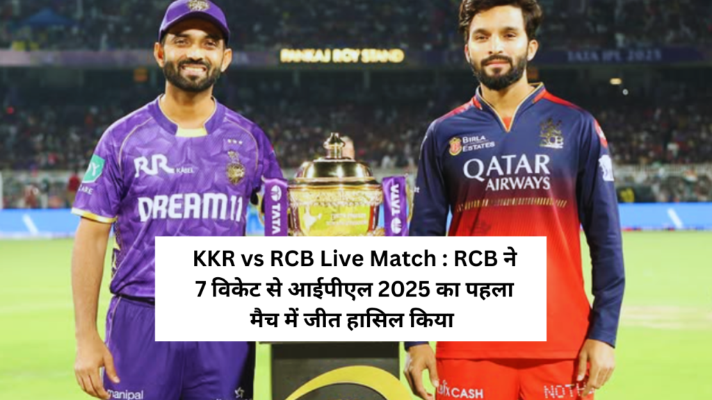 KKR vs RCB Live Match and Score: आईपीएल 2025 के उद्घाटन मैच में रॉयल चैलेंजर्स बैंगलोर (आरसीबी) ने कोलकाता नाइट राइडर्स (केकेआर) को 7 विकेट से हराया। ईडन गार्डन्स, कोलकाता में खेले गए इस मुकाबले में केकेआर ने पहले बल्लेबाजी करते हुए 20 ओवर में 8 विकेट पर 174 रन बनाए। जवाब में, आरसीबी ने 16.2 ओवर में 3 विकेट खोकर लक्ष्य हासिल कर लिया। आरसीबी के कप्तान रजत पाटीदार ने 16 गेंदों में 34 रनों की शानदार पारी खेली, जिसमें 5 चौके और 1 छक्के शामिल थे। विराट कोहली ने भी 59 रन का योगदान दिया। गेंदबाजी में, आरसीबी के जोश हेजलवुड ने 4 ओवर में 22 रन देकर 2 विकेट लिए, जिससे केकेआर की टीम बड़ा स्कोर खड़ा करने में नाकाम रही। इस जीत के साथ, आरसीबी ने टूर्नामेंट की शानदार शुरुआत की है।